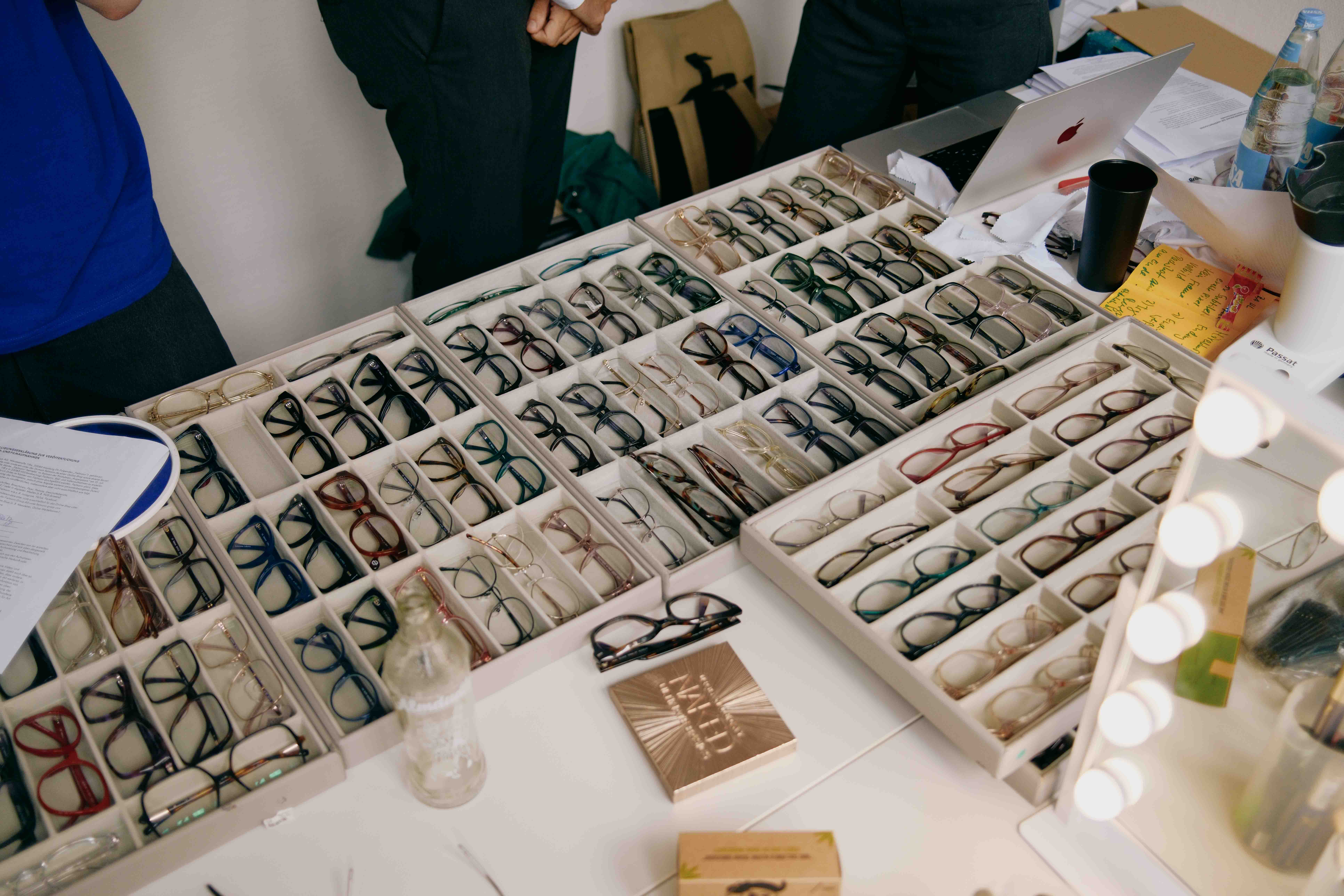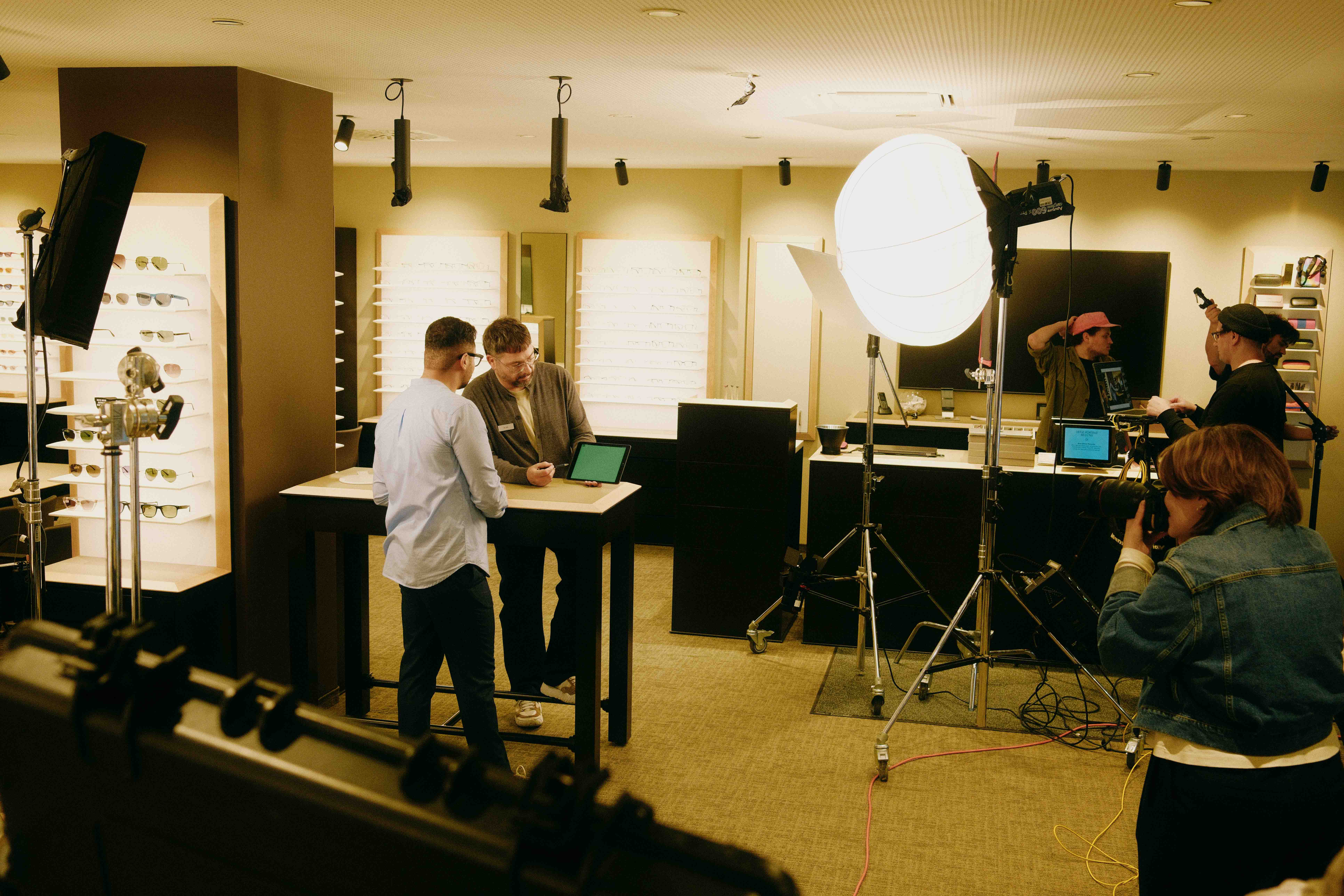 An drei Produktionstagen arbeiteten wir mit einem dualen Setup aus hochauflösender Fotografie und parallelen Videoaufnahmen für Reels. Jeder Mitarbeitende durchlief denselben strukturierten Ablauf, inklusive individuell zugewiesener Brillen und klarer Set-Routine. Ein komplexes Lichtsetup mit starkem Dauerlicht und viel Diffusion sorgte für gleichmäßige Ausleuchtung und reduzierte Reflexionen auf den Gläsern. Auf Blitzlicht wurde bewusst verzichtet, um parallel Videoaufnahmen zu ermöglichen.